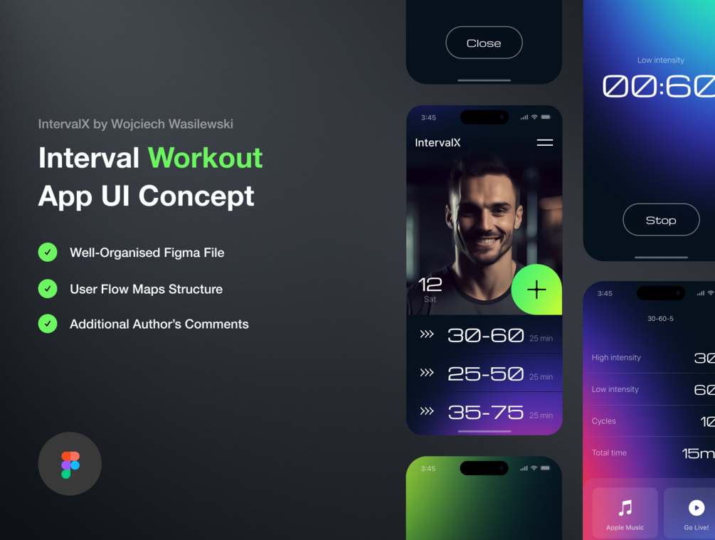 IntervalX is an interval workout app UI concept that takes on the digital sport products challenges, as well as, tests the possibilities of the AI. As a buyer, you'll get a Figma file including around 20 unique screens (30 in total) covering the most important aspects of a workout app.